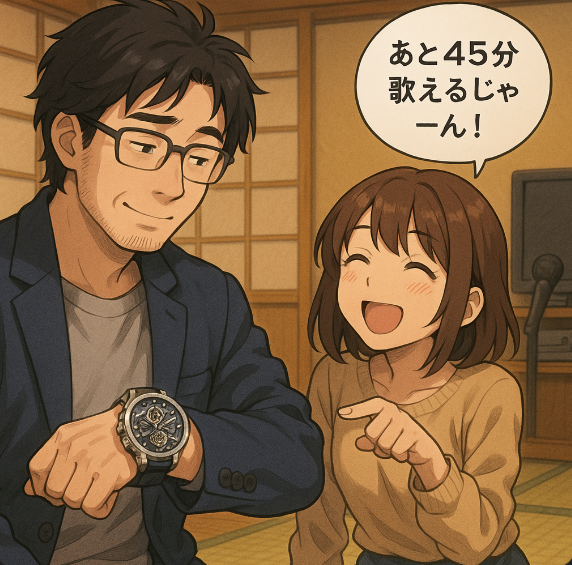 今の時間を示そうと指をさそうとしたら、一番大きな盤面では〜15分くらいを針が指していたのその女性が見て「後45分歌えるじゃーん!」と言った