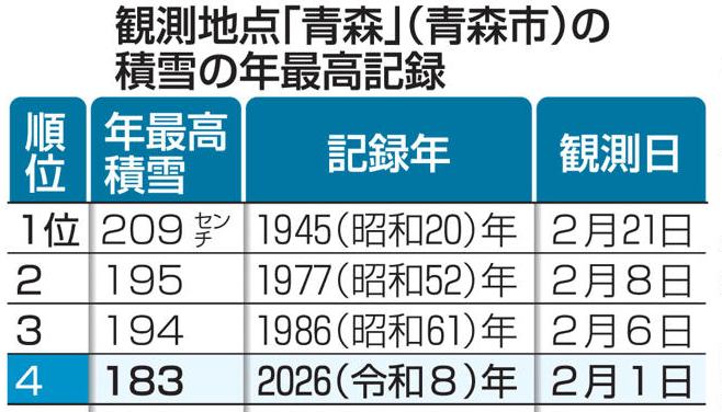 2026年の現状: 2026年1月末から2月にかけて、青森市では積雪が183cmに達し、1月の積雪深としては戦後最高(1945年以来、約81年ぶりの高水準)を記録しました。