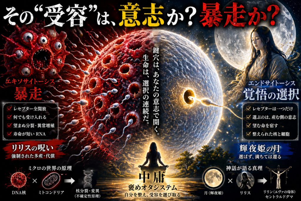* 拒絶(エンドサイトーシス): 精神的な拒絶や防衛本能が、細胞レベルでレセプターを隠し、不妊や遮断を引き起こす可能性(輝夜姫のメタファー)。