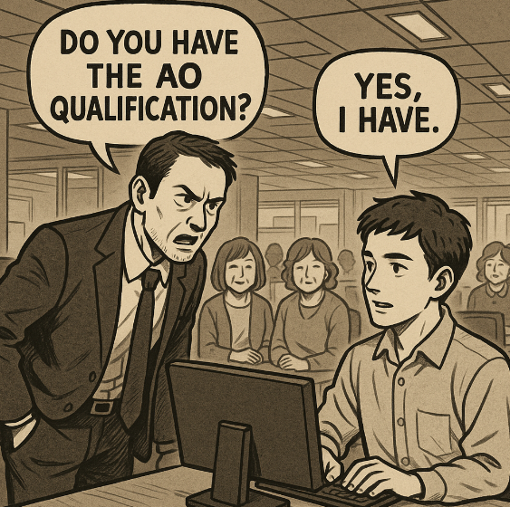 「調べましたよ!こういう仕事ってAO資格必要らしいですね、持ってるんですよね?」と聞いてきた
