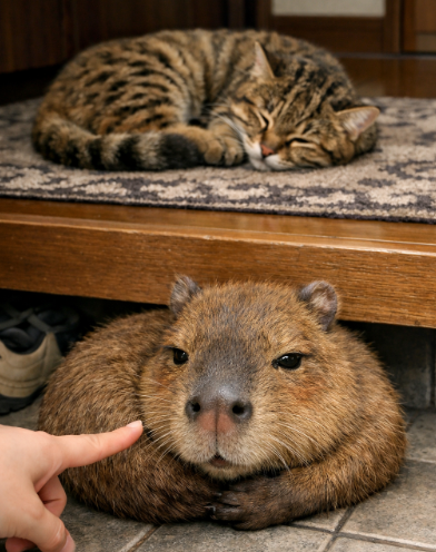 カピバラは「世界最大のネズミ」の仲間で、南米の温暖な水辺に生息する草食動物です。驚くほど穏やかで人にもなつく性格ですが、野生ではワニやジャガーがいる環境で堂々と泳いだり、ワニの上に乗るほどの大胆不敵な一面を持つこともあります。
