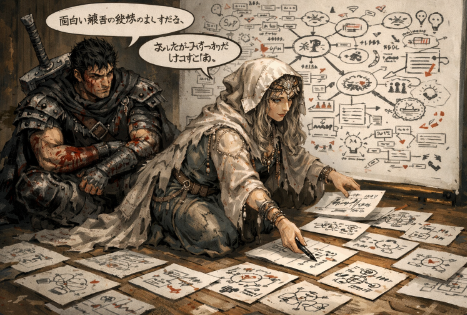 「面白い独自の発想の出し方だな」と伝えると彼女は「あんたがメチャクチャにしたけどね」と強気な事を言われたが、そのスラスラと何かを書いては、独自のパターンなのか書いた紙を床に並べ変えていく作業に目を奪われた感じで…