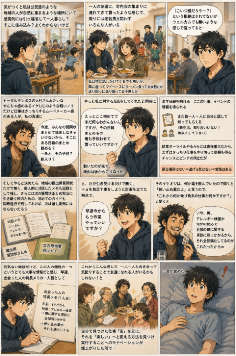 まず日報を触れる=ここの行事、イベントの情報を得られる。また皆一人一人に自分と話して知ってもらえる(新生活、知り合いいない!仲良くして下さい)