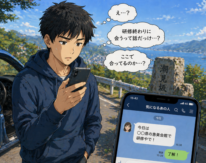 私はふと、道端で石に寄りかかって携帯のLINEを見ると「今日は…県の恵美会館で研修やで!」と書かれていたから