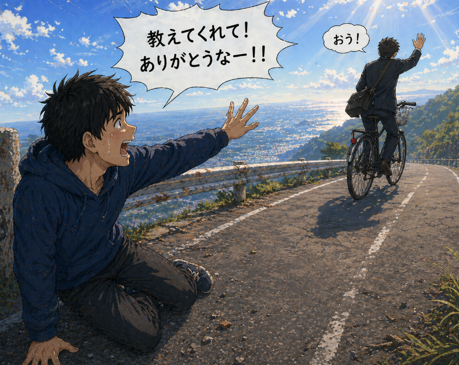 例え着地で無様に転んでもいいから、落ちない元の道に戻らねば…と腰が引けた無様なジャンプで着地をし、私は咄嗟に「すいません・・」と言葉にすると相手は「ふん!」と言う感じで自転車で立ち去った